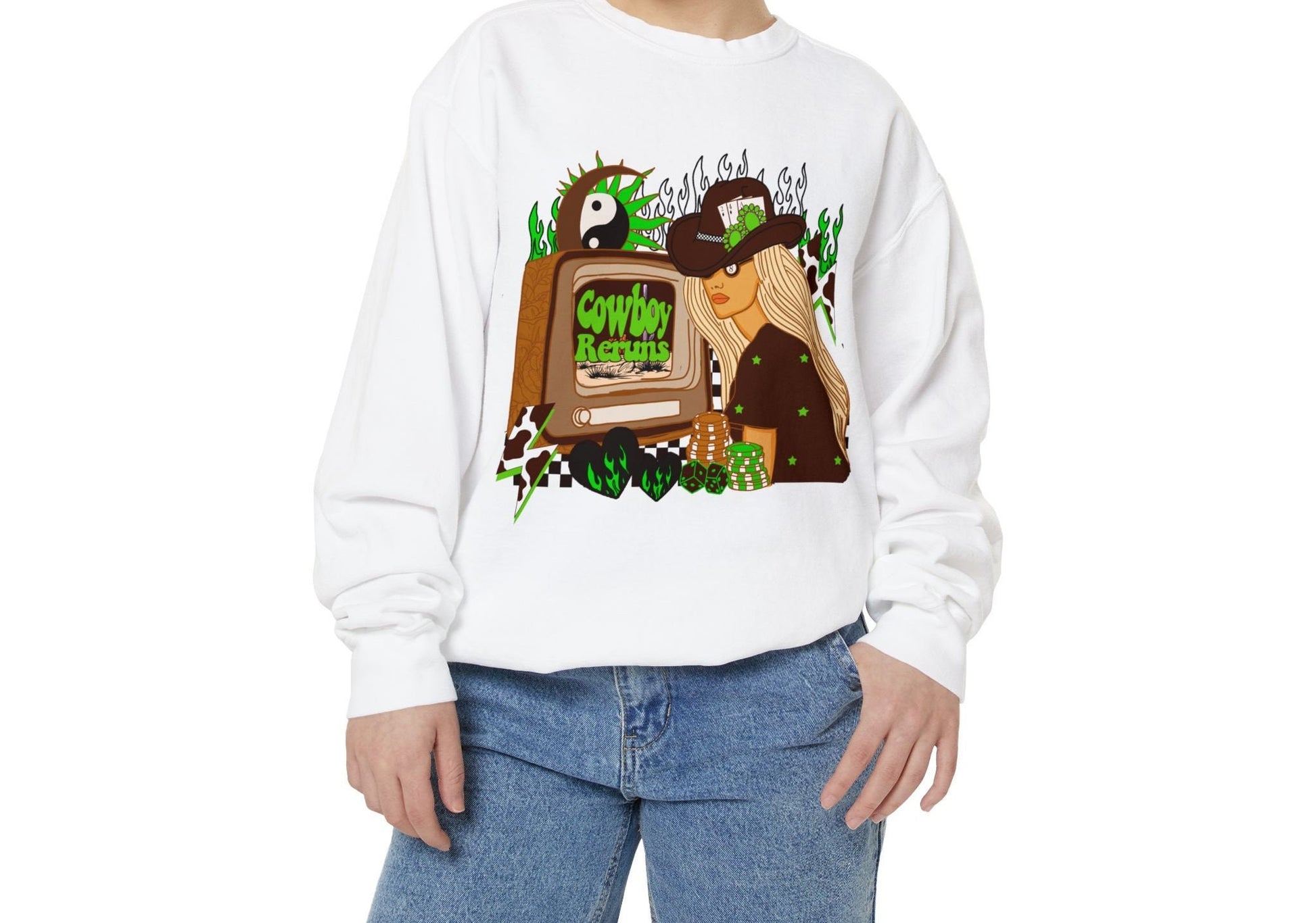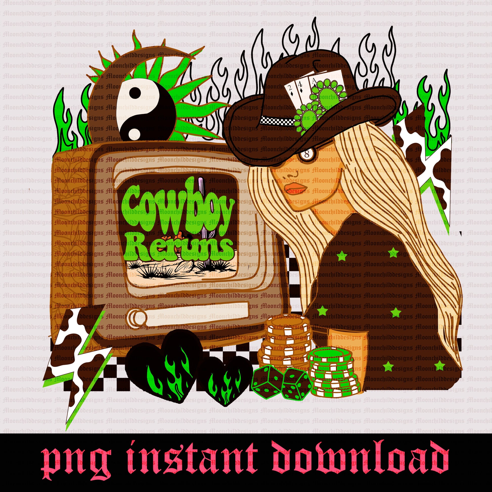 Cowboy reruns Retro western graphic trendy checkered flames turquoise celestial flaming hearts cowprint lightning bolt png instant download
