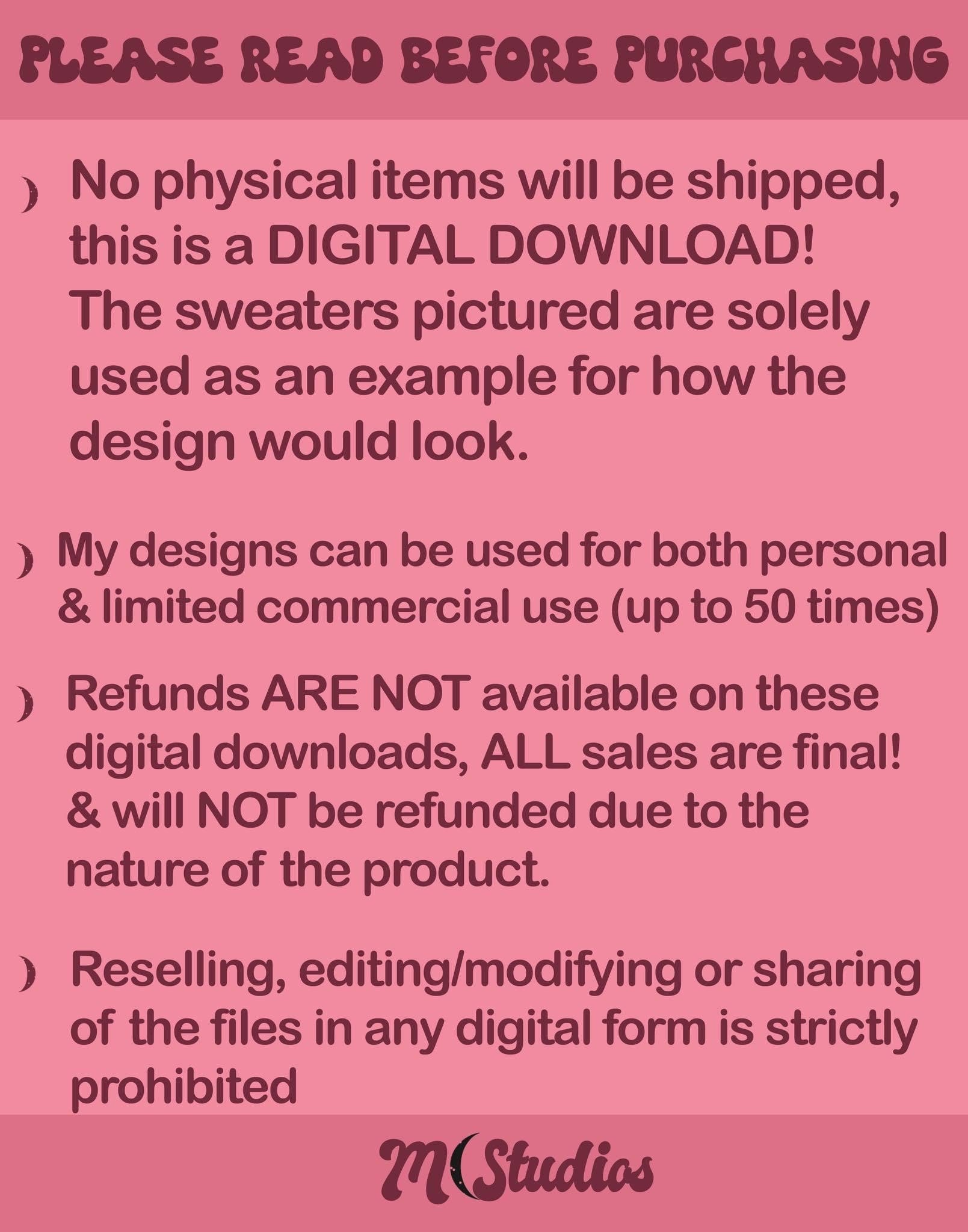 Refunds ARE NOT available on these digital downloads,ALL sales are final & will NOT be refunded due to the nature of the product