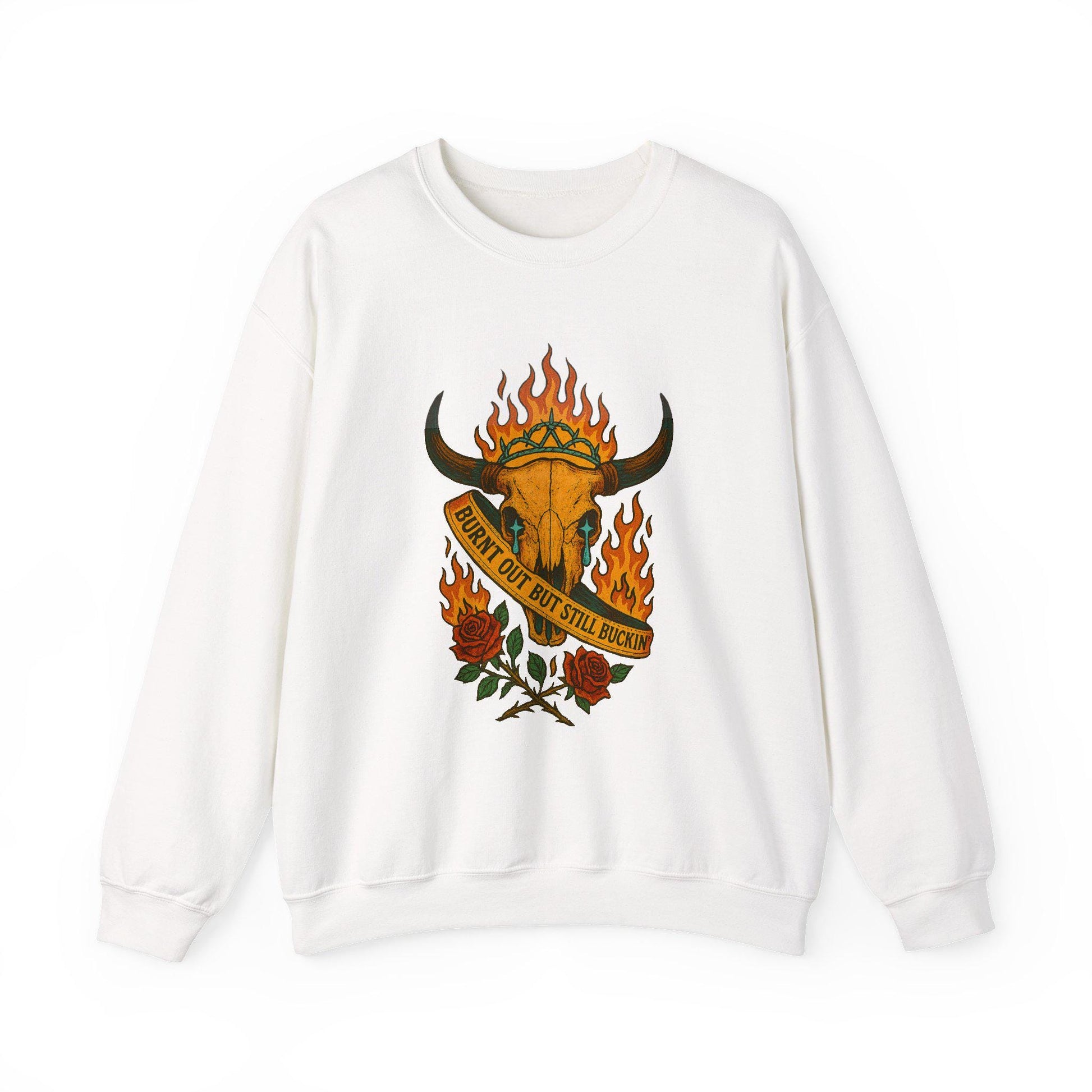 Edgy Western pageant flaming bull skull "burnt out but still buckin" png graphic INSTANT digital download for tshirt sublimation or dtf