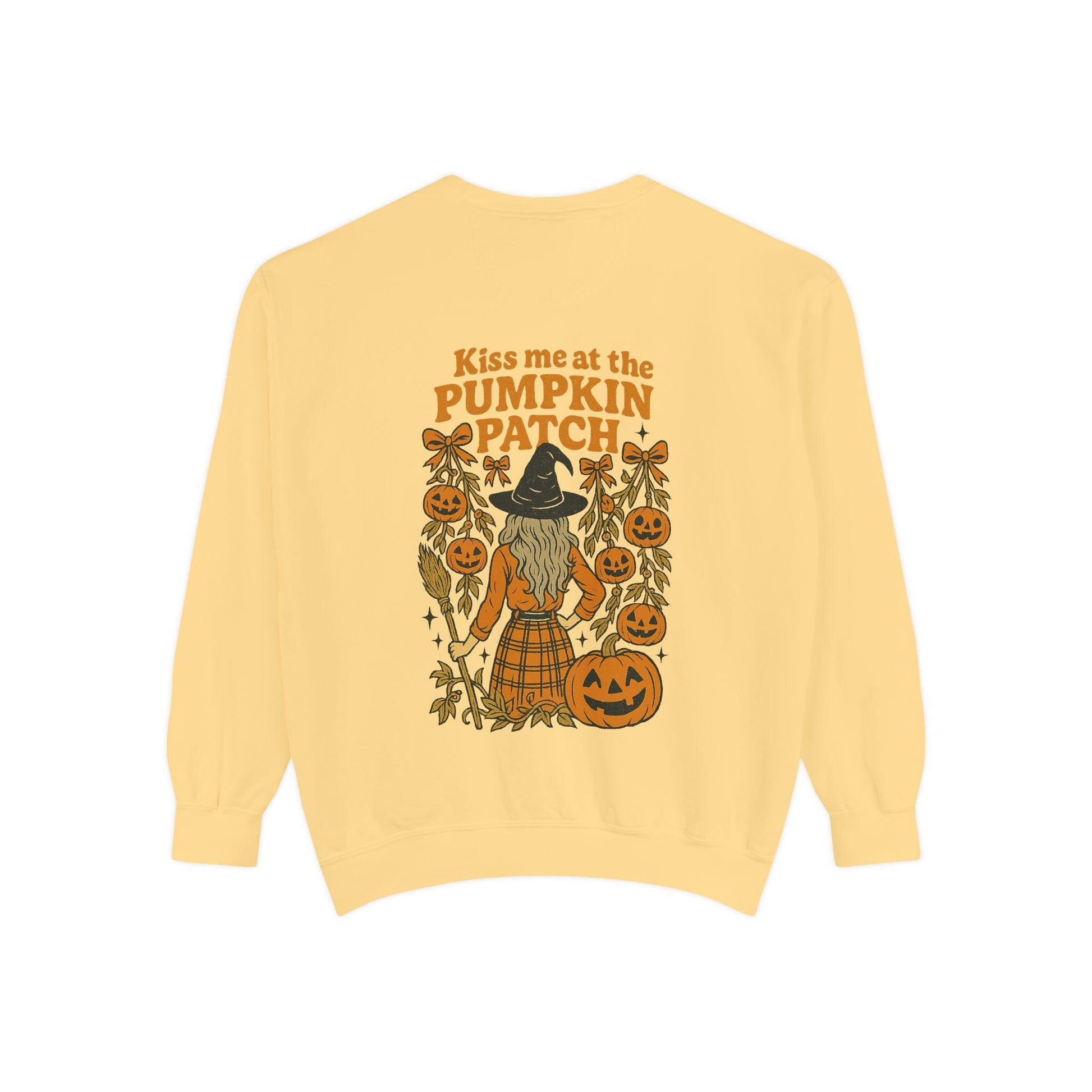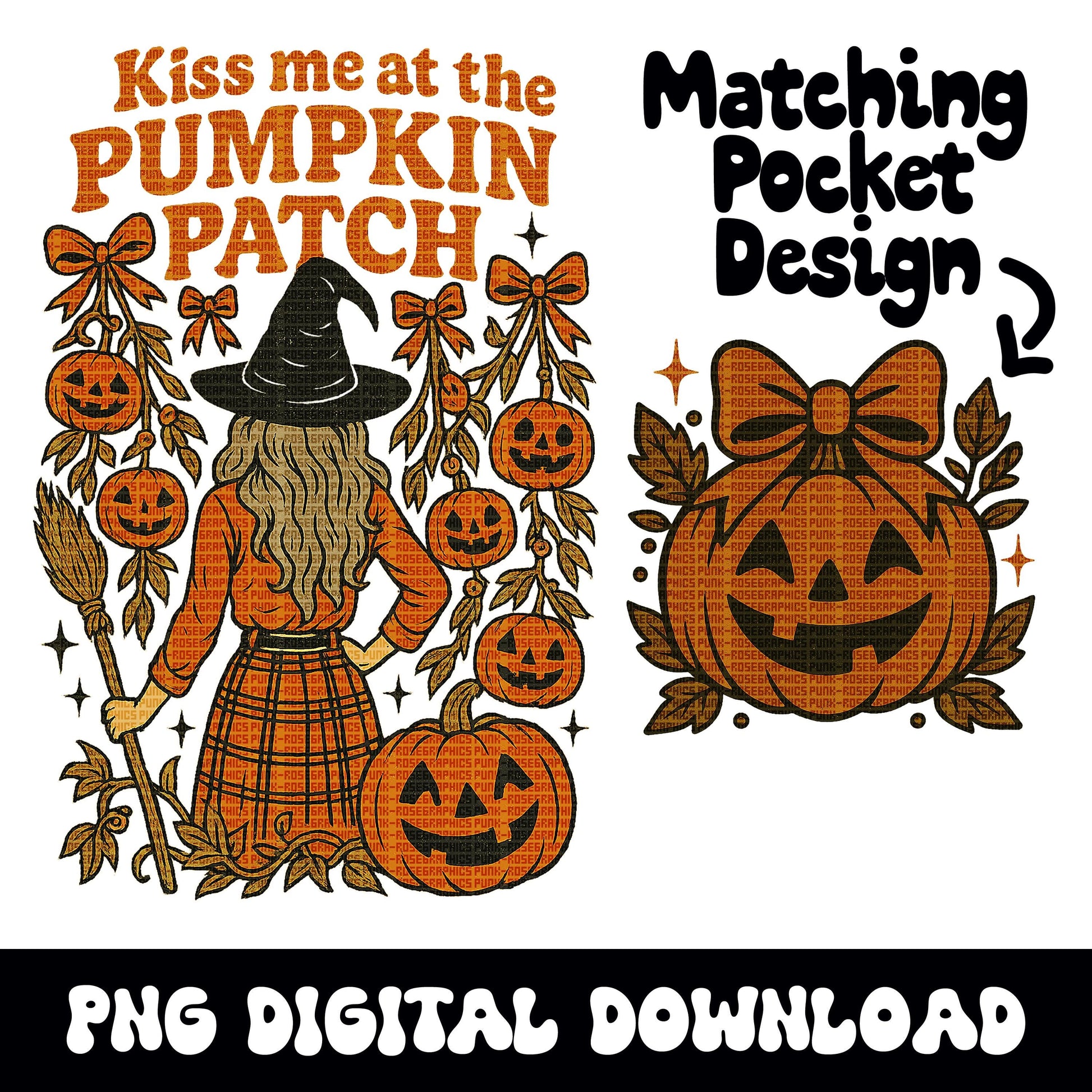 Halloween "kiss me at the pumpkin patch" witch PNG graphic digital downloads for tshirt sublimatiion or dtf