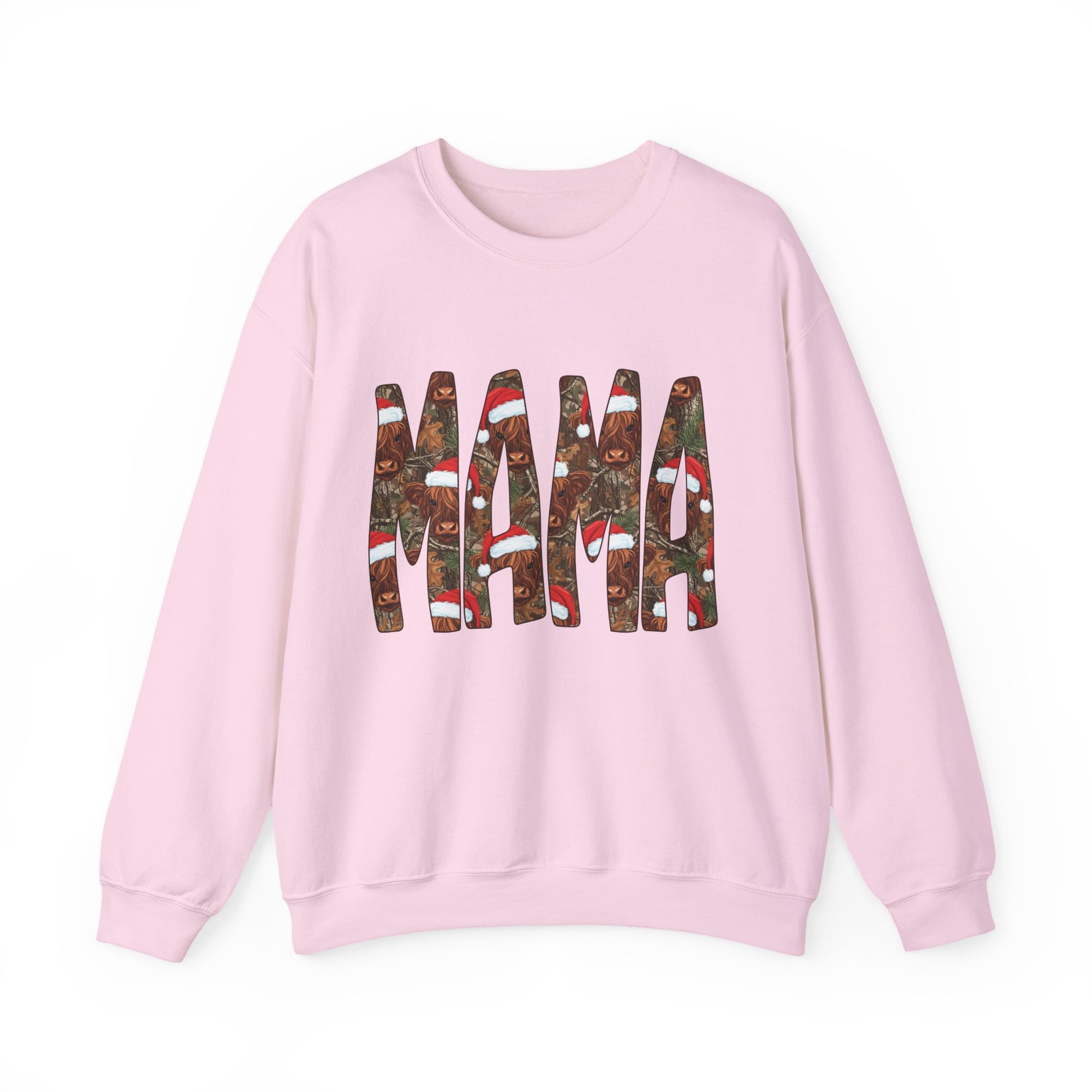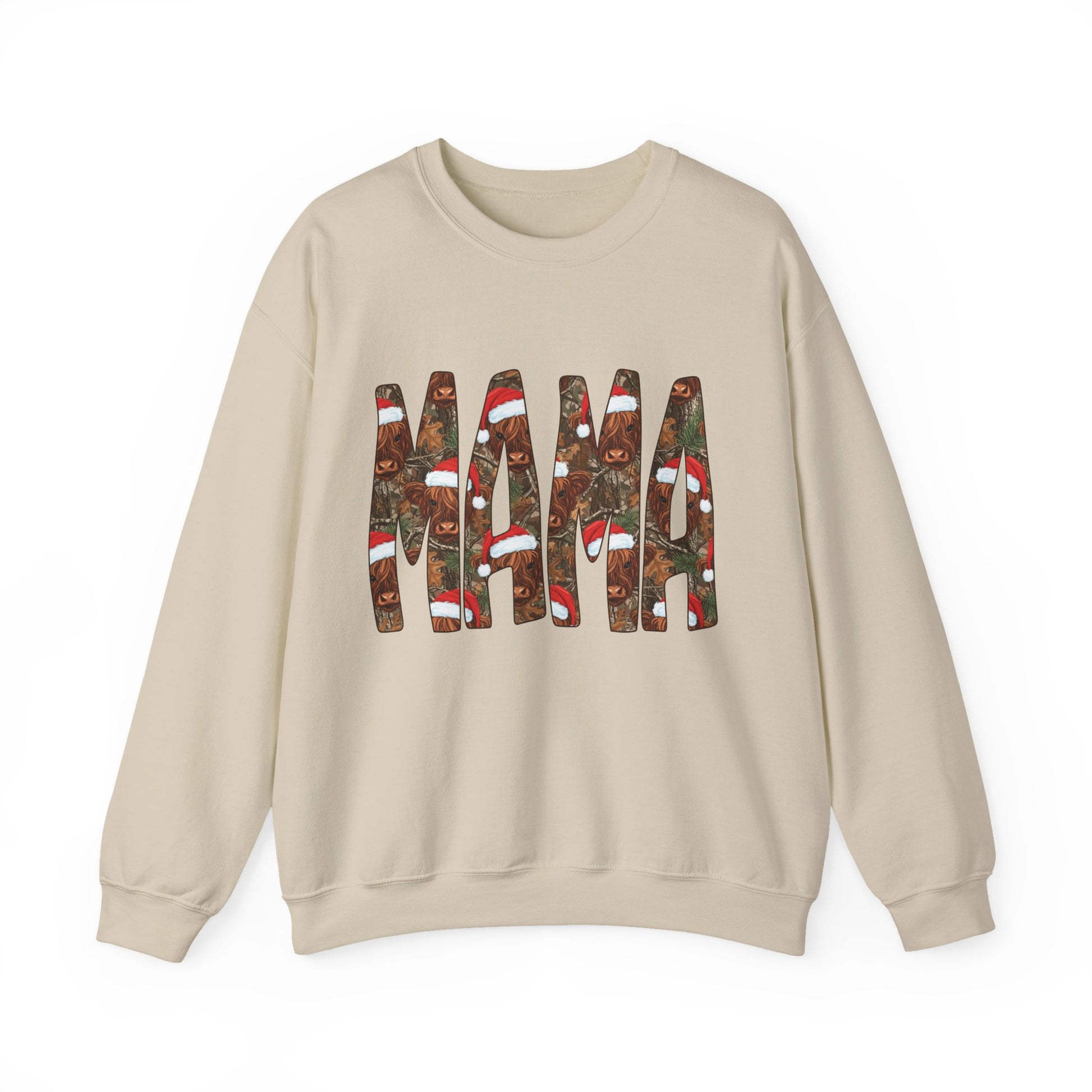 Mama Highland Cow & Camo Sweatshirt — Festive Christmas Mama Crewneck
