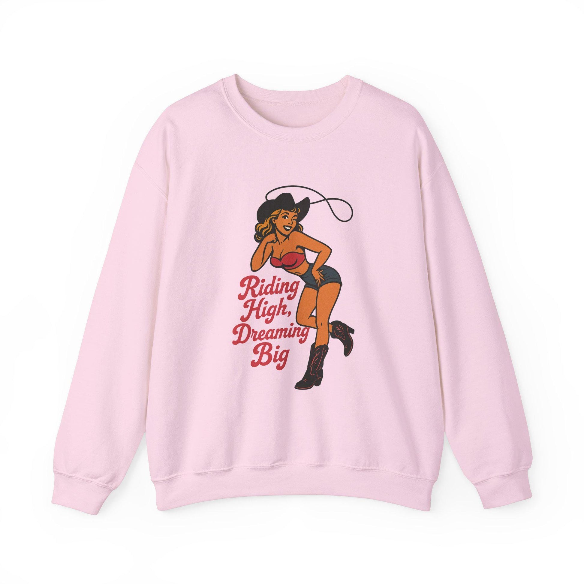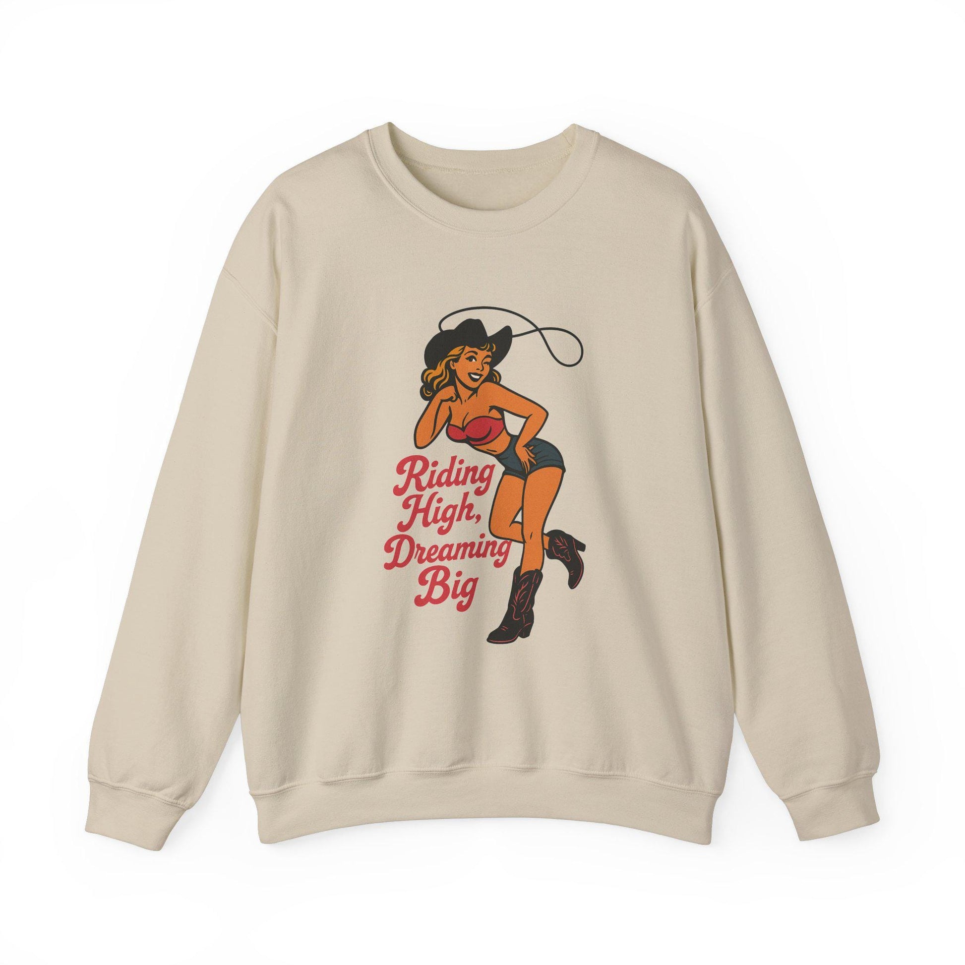 Riding high dreaming big western pinup cowgirl png graphic digital download for sublimation and dtf