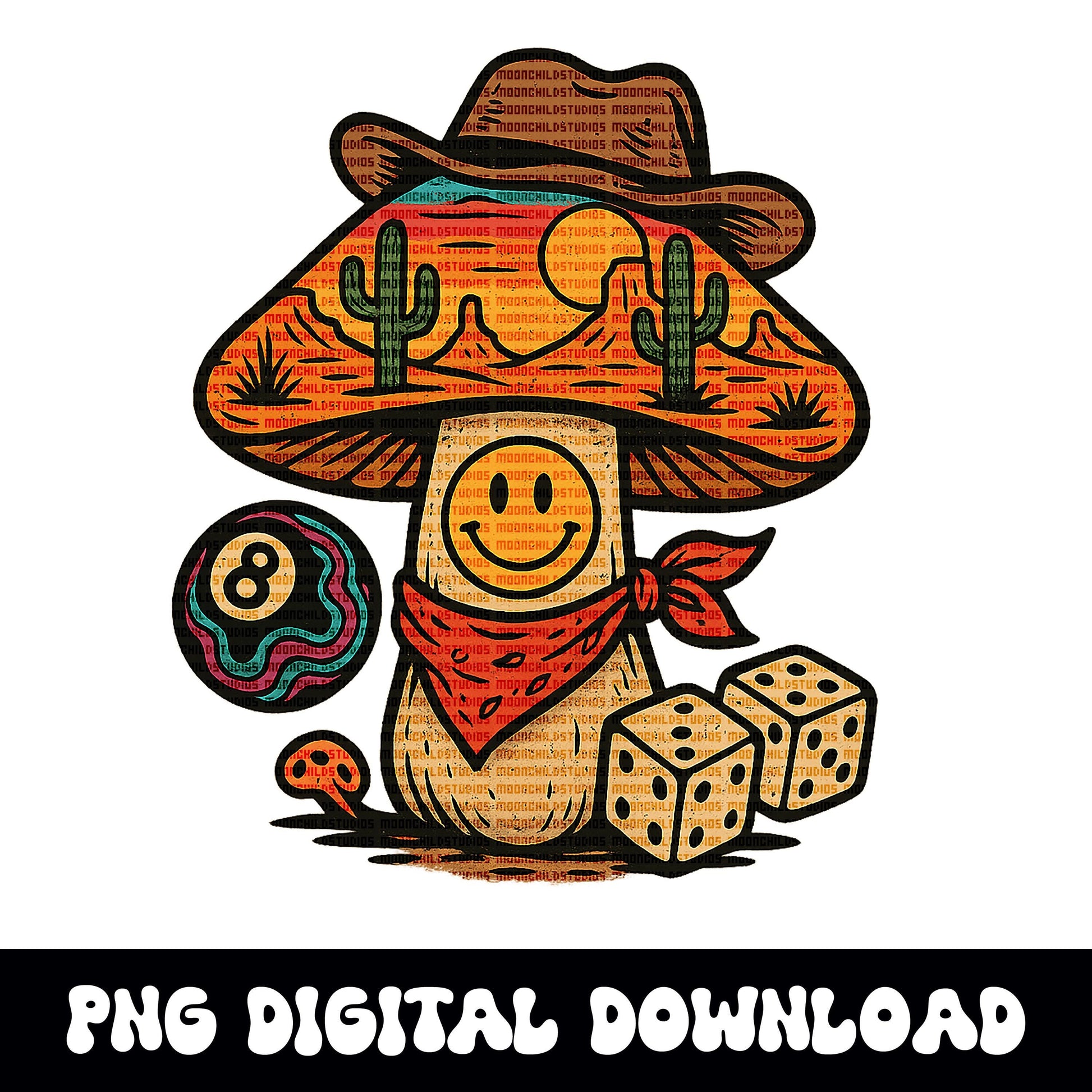 Trippy western desert smiley mushroom 8ball dice PNG graphic INSTANT digital download for tshirt sublimation or dtf