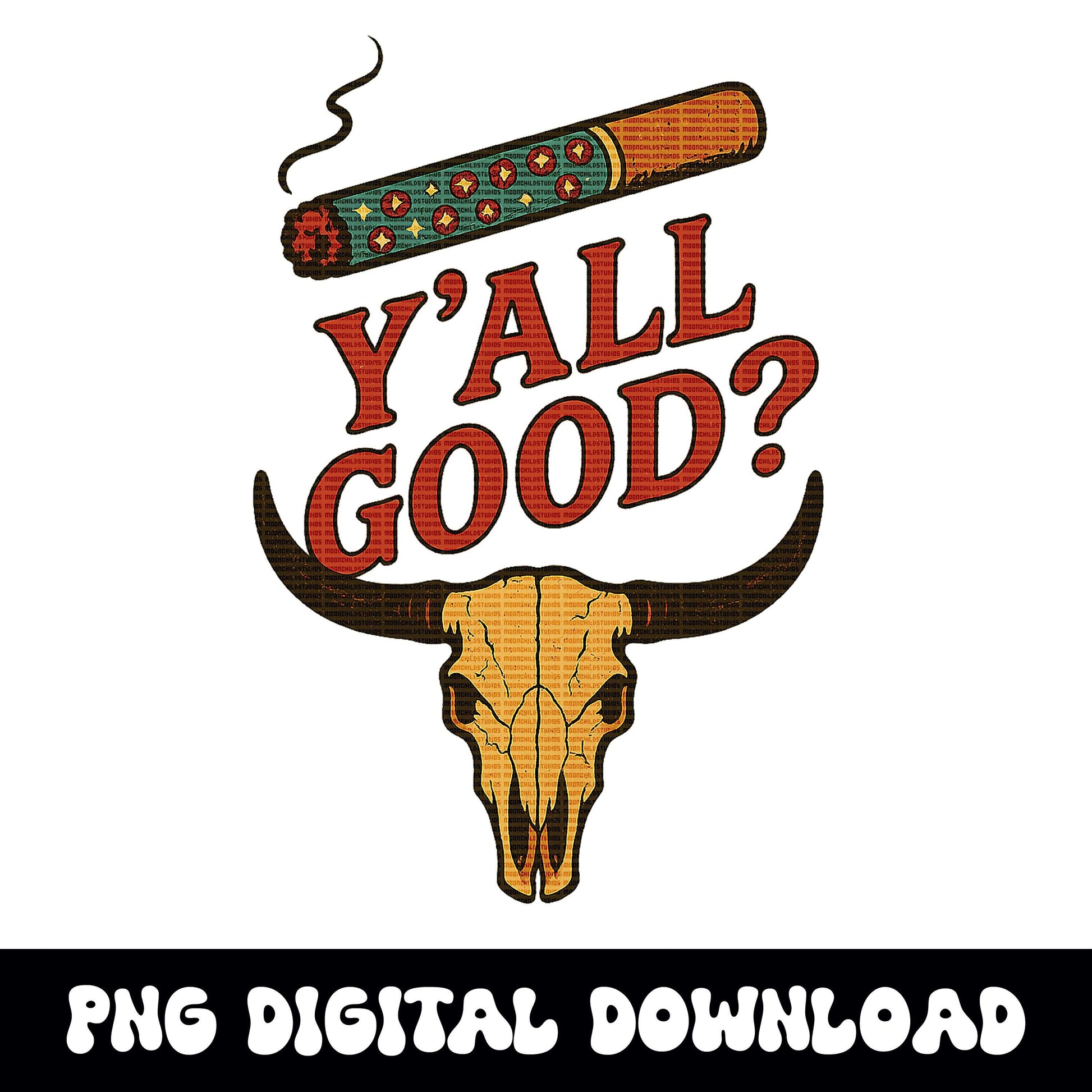Western bull skull "yall good" cigarette PNG graphic INSTANT digital download for tshirt sublimation or dtf
