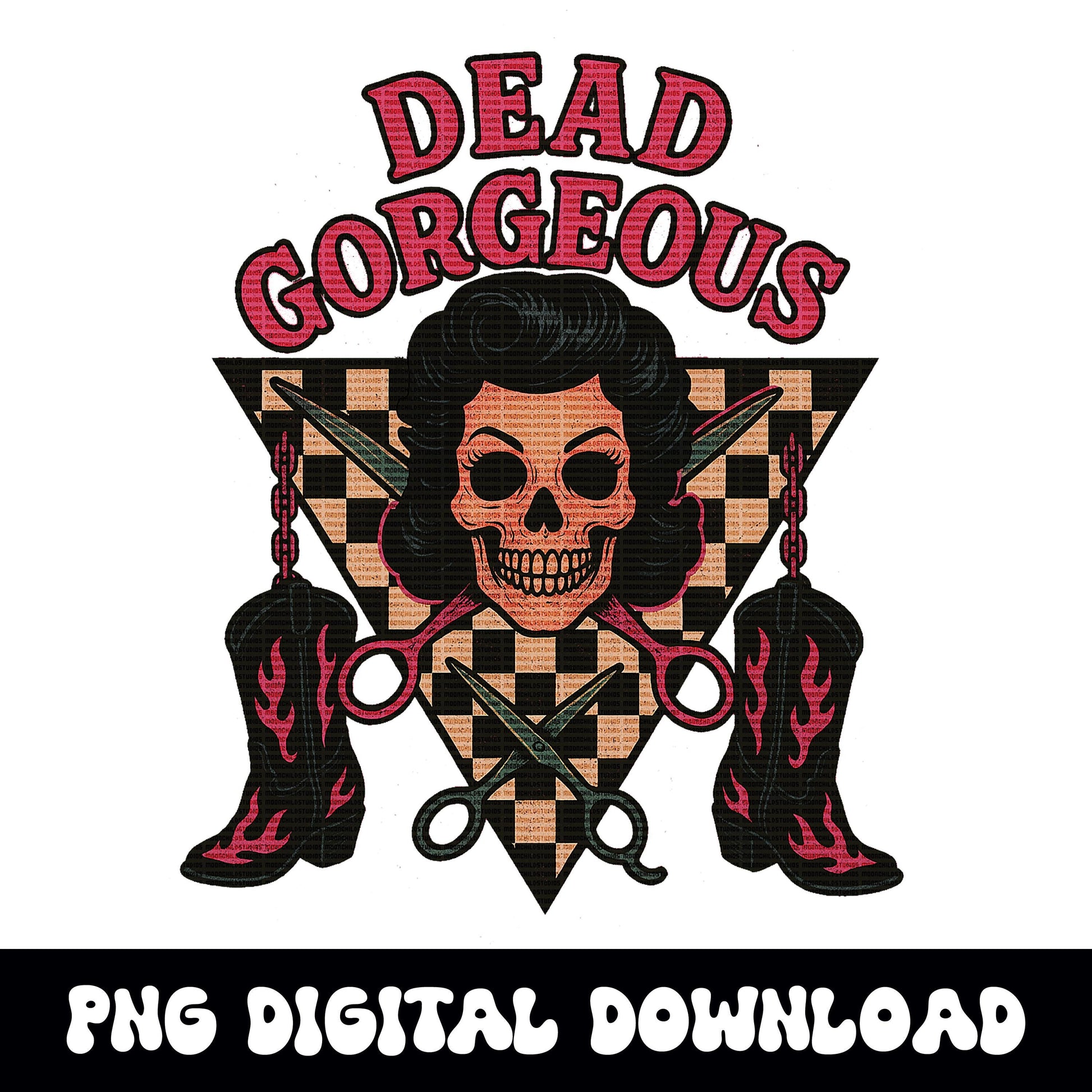 Western "dead gorgeous" yallternative retro pinup woman skull checkered png graphic INSTANT digital download for tshirt sublimation or dtf