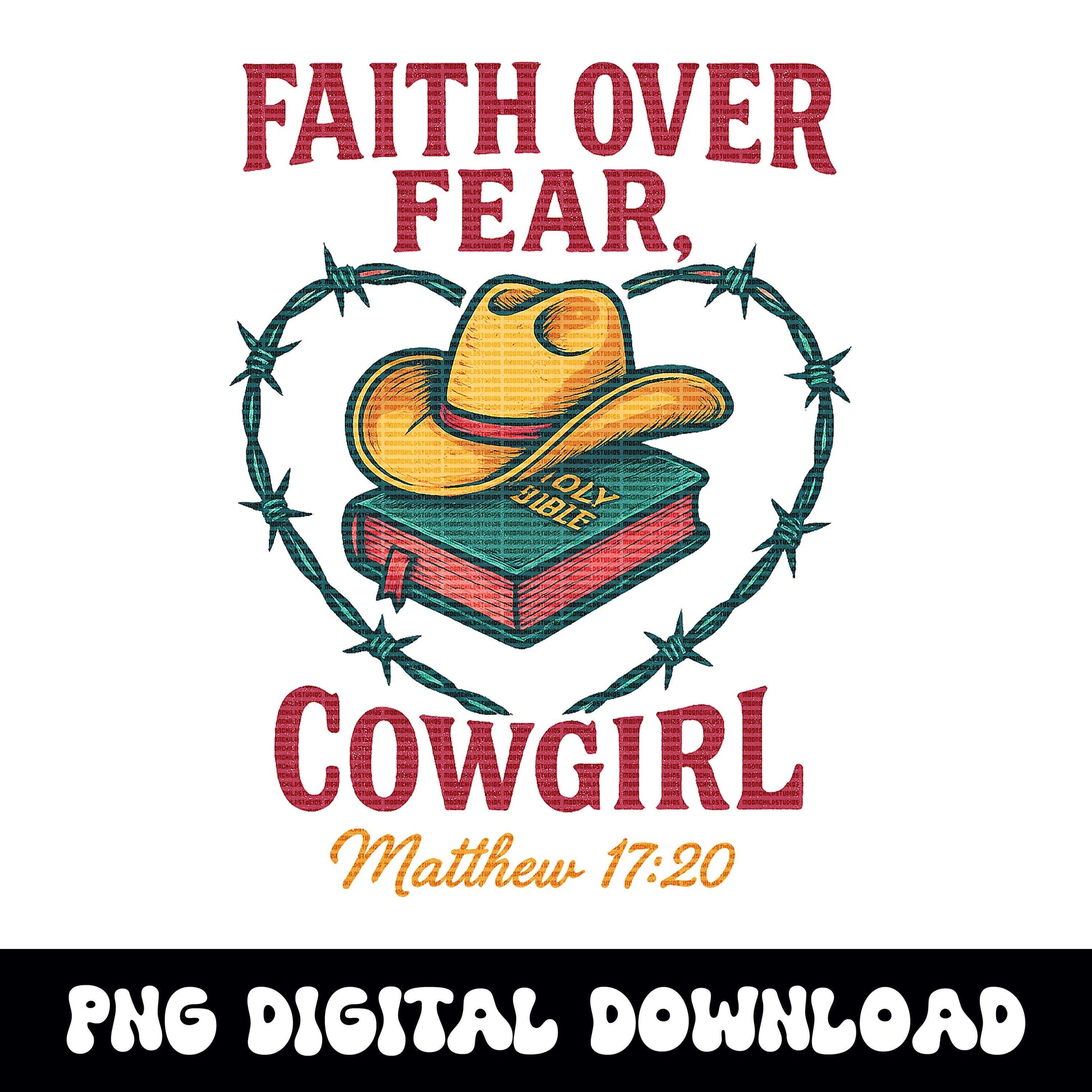 Western "faith over fear" bible cowgirl hat barbed wire heart christian PNG graphic INSTANT digital download for tshirt sublimation or dtf