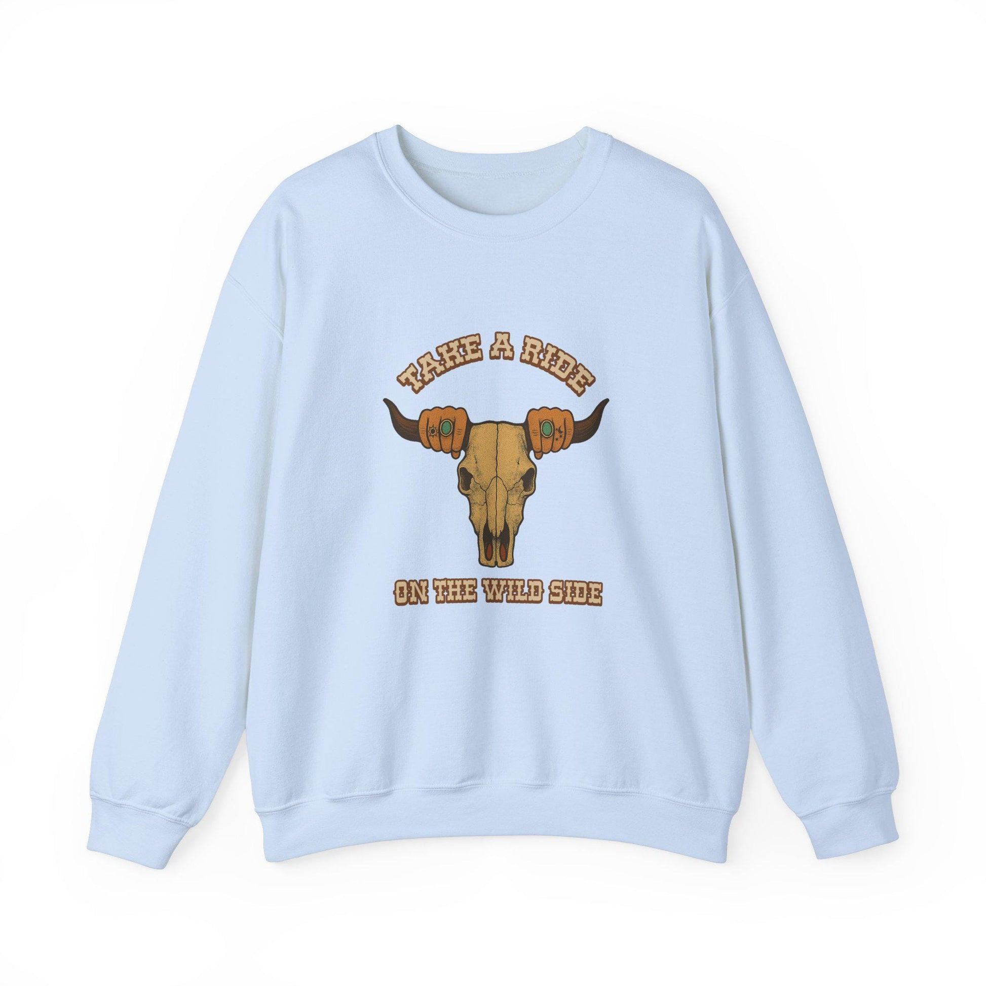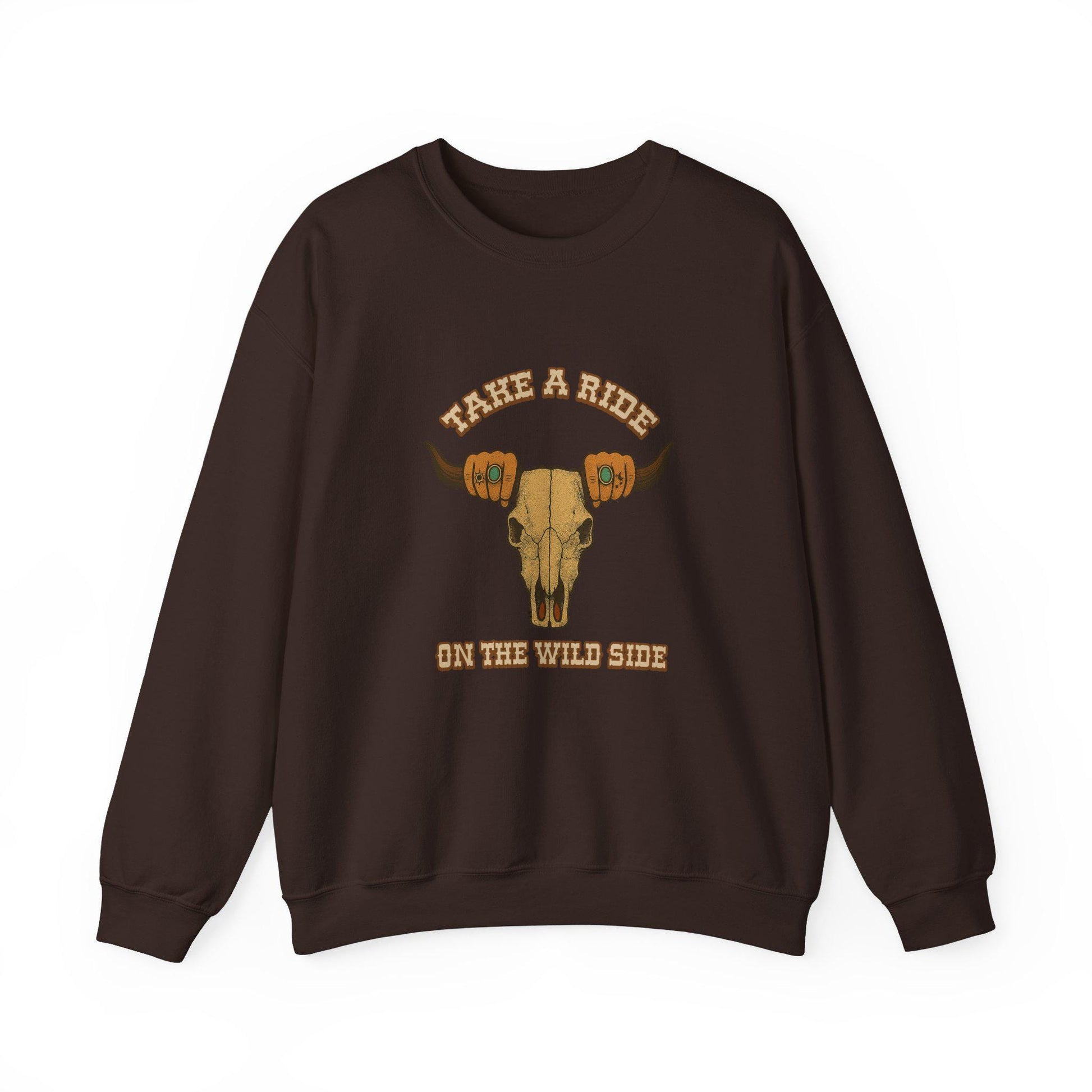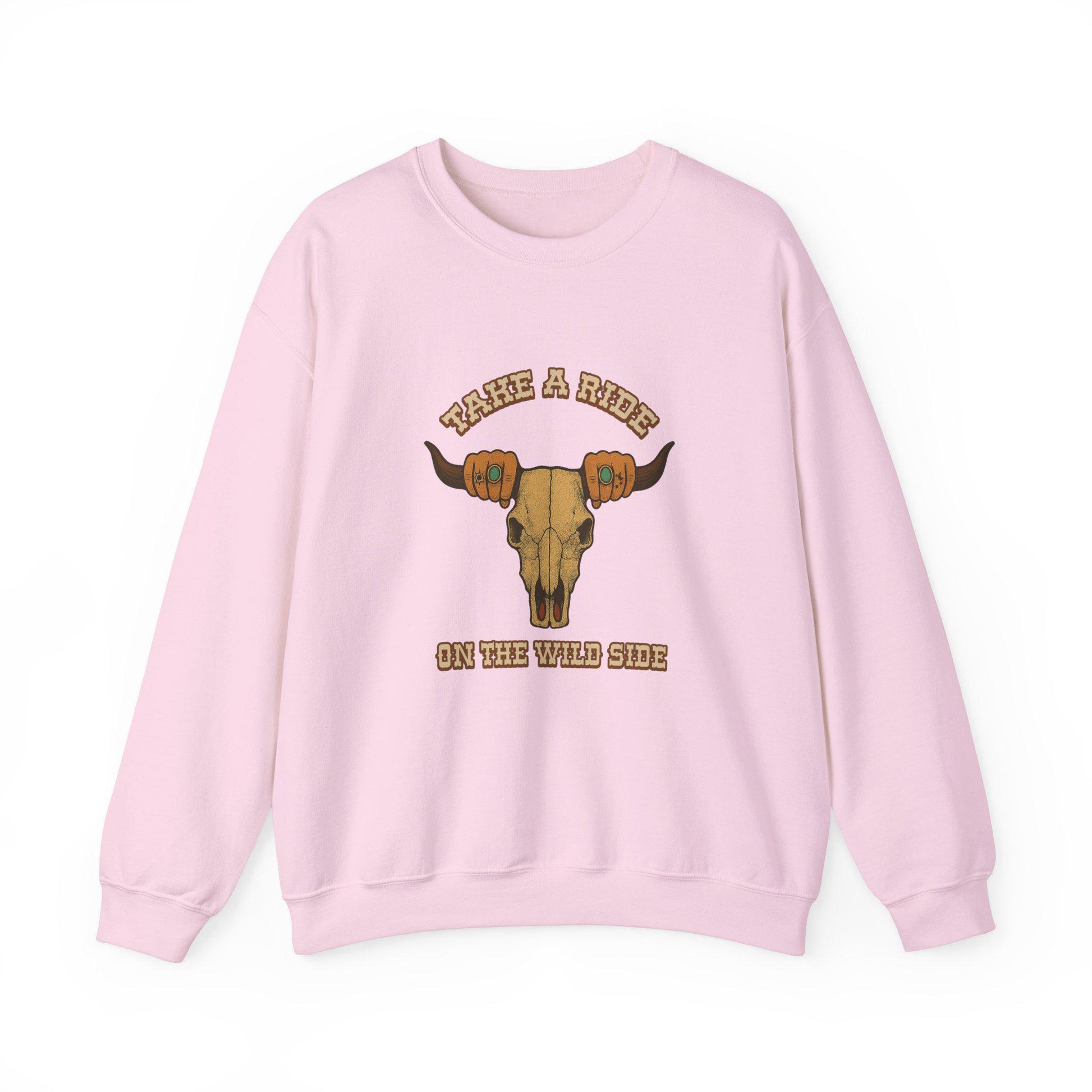 Western "take a ride on the wild side" cowgirl bull skull png graphic digital download for tshirt sublimation or dtf